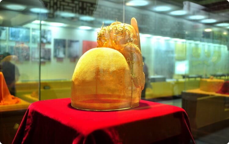 The underground part is the Underground Palace, which was unearthed between 1956 and 1958. It is the most valuable part of Dingling Tomb. The palace really deserves a careful visit as it is the only unearthed palace of the Thirteen Imperial Tombs of Ming Dynasty. Starting from the ground, after more than 40 meters (130 feet) of the underground tunnel, you can access to the hidden palace. The stone structure of the palace is a representative style of the Ming Dynasty. The entire palace is divided into five communicant vaulted halls: the front, the middle, the rear, the left and the right halls, among which the rear hall is the main and largest. The entrance of each hall is made of sculptured jade, and the floors are covered with gilded bricks. In the middle of each hall is a white marble coffin. On each coffin there is a square hole called Gold Well filled with loess. A paved path leads to the central hall where there are three white marble thrones, in front of which incense, candles and flowers were set. Before each of them, there are the glazed Five Offerings and a blue china jar that would have been filled with sesame oil to be used for lamps. The coffins of Emperor Zhu Yijun and his two empresses are in the rear hall. There are also some precious items displayed with these coffins, such as jades, vases, red lacquer boxes, golden crown, silver, silk and so on. The Underground Palace unearthed a total of over 3,000 pieces of cultural relics, including four national treasures: the gold imperial crown, the gold empress crown, glowing pearl and tri-colored glazed pottery of the Ming Dynasty. These relics are all stored in the Dingling Tomb Museum.